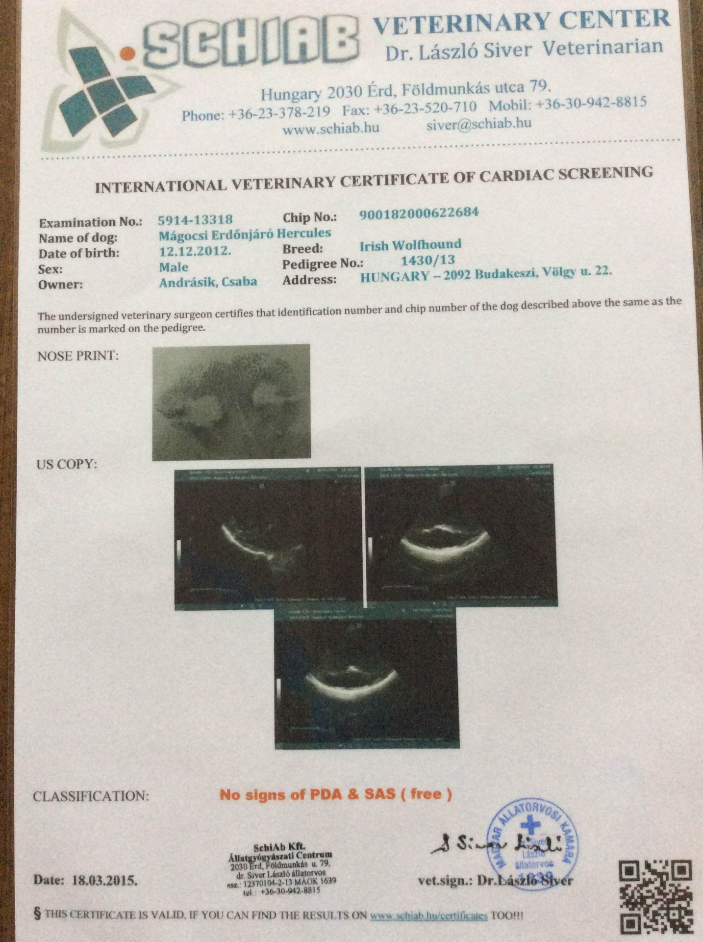 Krytie prebehlo 29.5.2016 v Madarsku. Šteniatka sa narodili 29.7.2016. Obaja rodičia majú vyšetrenie srdca.